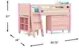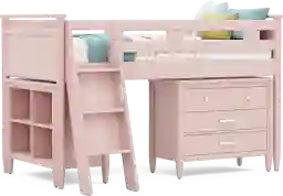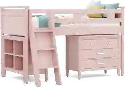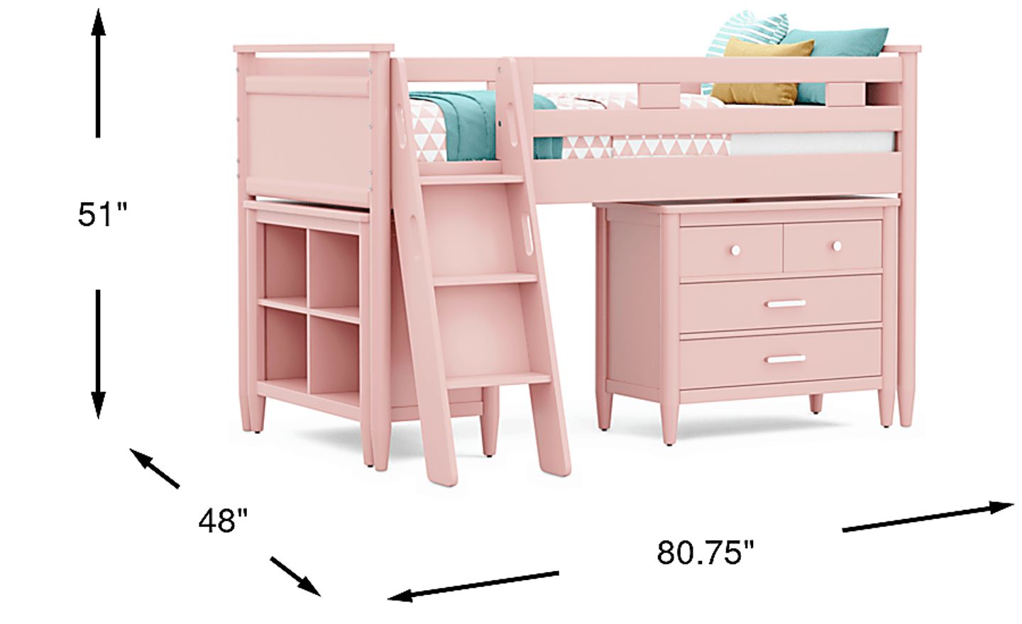 The ultimate collection for your color obsession is finally here with the Modern Colors twin low loft bed. Showcasing pink finish, each piece balances ultra-sleek craftsmanship with easygoing comfort. Featuring a twin bed that sits lower to the ground than a traditional loft, this piece features a ladder that affixes to the side of the frame for three easy steps up and three easy steps down. The coordinating loft chest has three drawers crafted with front French dovetail joints and ball bearing, side mounted glides. A matching 37-inch bookcase can shelve books, comics, magazines, decor and more. The hardware is finished in brushed nickel but brushed gold knobs and pulls are also included with purchase. Mattress and foundation (if required) sold separately. This product requires a bunkie board (sold separately).