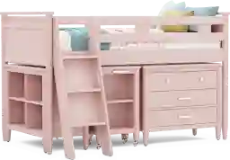 The ultimate collection for your color obsession is finally here with the Modern Colors twin low loft bed. Showcasing pink finish, each piece balances ultra-sleek craftsmanship with easygoing comfort. Featuring a twin bed that sits lower to the ground than a traditional loft, this piece features a ladder that affixes to the side of the frame for three easy steps up and three easy steps down. The coordinating loft chest has three drawers crafted with front French dovetail joints and ball bearing, side mounted glides. Soar through study time with the coordinating caster desk that can be wheeled out and around at a moment's notice. The desk even has a couple cubbies that are perfect for textbooks or homework supplies. A matching 37-inch bookcase can shelve books, comics, magazines, decor and more. The hardware is finished in brushed nickel but brushed gold knobs and pulls are also included with purchase. Mattress and foundation (if required) sold separately. This product requires a bunkie board (sold separately).