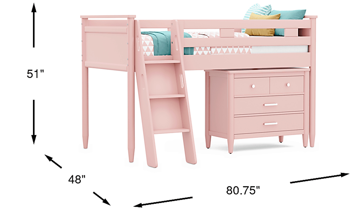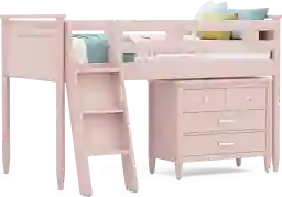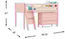 The ultimate collection for your color obsession is finally here with the Modern Colors twin low loft bed. Showcasing pink finish, each piece balances ultra-sleek craftsmanship with easygoing comfort. Featuring a twin bed that sits lower to the ground than a traditional loft, this piece features a ladder that affixes to the side of the frame for three easy steps up and three easy steps down. The coordinating loft chest has three drawers crafted with front French dovetail joints and ball bearing, side mounted glides. The hardware is finished in brushed nickel but brushed gold knobs and pulls are also included with purchase. Mattress and foundation (if required) sold separately. This product requires a bunkie board (sold separately).
