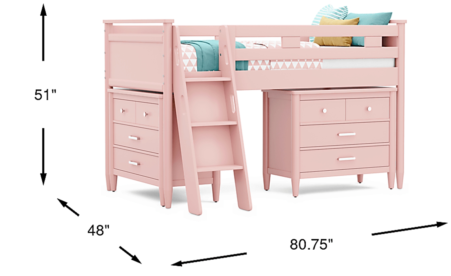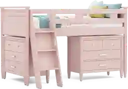 The ultimate collection for your color obsession is finally here with the Modern Colors twin low loft bed. Showcasing pink finish, each piece balances ultra-sleek craftsmanship with easygoing comfort. Featuring a twin bed that sits lower to the ground than a traditional loft, this piece features a ladder that affixes to the side of the frame for three easy steps up and three easy steps down. Two coordinating loft chests have three drawers crafted with front French dovetail joints and ball bearing, side mounted glides. The hardware is finished in brushed nickel but brushed gold knobs and pulls are also included with purchase. Mattress and foundation (if required) sold separately. This product requires a bunkie board (sold separately).