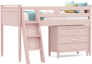 The ultimate collection for your color obsession is finally here with the Modern Colors twin low loft bed. Showcasing pink finish, each piece balances ultra-sleek craftsmanship with easygoing comfort. Featuring a twin bed that sits lower to the ground than a traditional loft, this piece has a reversible staircase that can be affixed to either side of the bed. The steps feature storage drawers that are perfect for stashing away clothing, books and more. The two coordinating loft chests each have three drawers crafted with front French dovetail joints and ball bearing, side mounted glides. All hardware is finished in brushed nickel but brushed gold knobs and pulls are also included with purchase. Mattress and foundation (if required) sold separately. This product requires a bunkie board (sold separately).