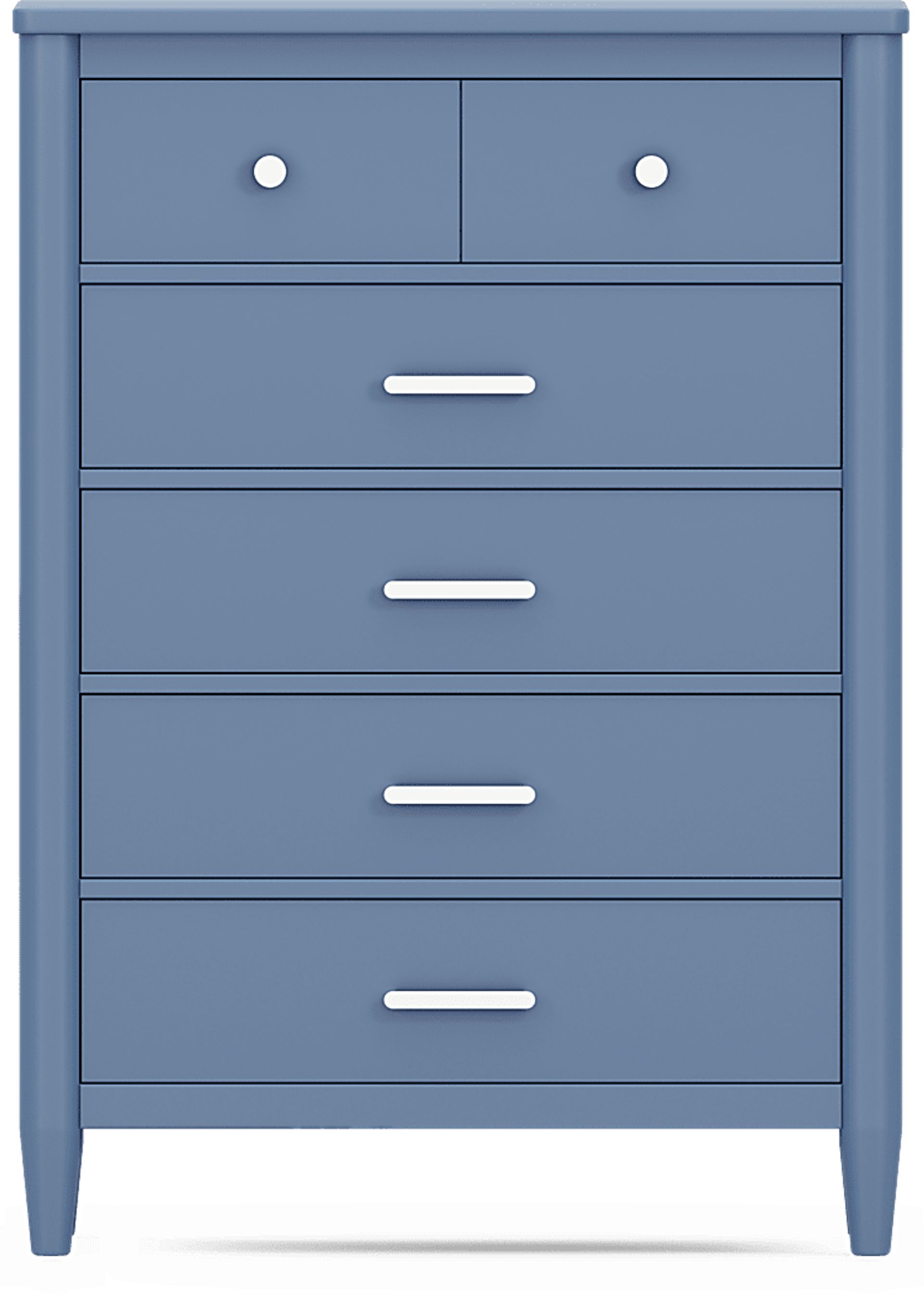 The ultimate style for your color obsession is finally here with the Modern Colors chest. Showcasing slate blue finish, this piece balances ultra-sleek craftsmanship with an easygoing look. Each of the five drawers are sanded smooth to help store clothing, extra bedlinens and more. The drawers are crafted with front French dovetail joints and have ball bearing, side mounted glides. Knobs on the top drawer and pulls on the remaining four drawers are finished in brushed nickel. Brushed gold hardware is also included with purchase. Tapered spun legs supply the chest with a chic final touch.