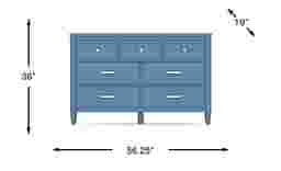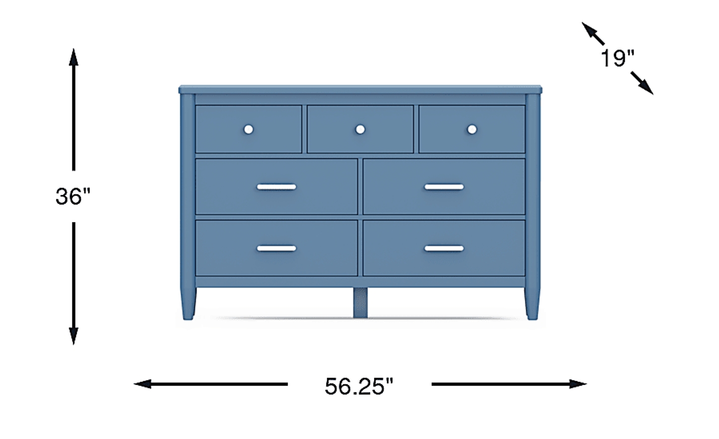 The ultimate style for your color obsession is finally here with the Modern Colors dresser. Showcasing slate blue finish, this piece balances ultra-sleek craftsmanship with an easygoing look. Each of the seven drawers are sanded smooth to help store clothing, extra bedlinens and more. The drawers are crafted with front French dovetail joints and have ball bearing, side mounted glides. Knobs on the top three drawers and pulls on the remaining four drawers are finished in brushed nickel. Brushed gold hardware is also included with purchase. Tapered spun legs supply the dresser with a chic final touch.