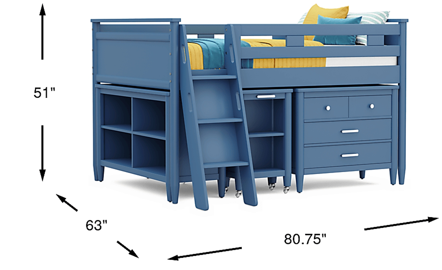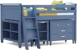 The ultimate collection for your color obsession is finally here with the Modern Colors full low loft bed. Showcasing slate blue finish, each piece balances ultra-sleek craftsmanship with easygoing comfort. Featuring a full bed that sits lower to the ground than a traditional loft, this piece features a ladder that affixes to the side of the frame for three easy steps up and three easy steps down. The coordinating loft chest has three drawers crafted with front French dovetail joints and ball bearing, side mounted glides. Soar through study time with the coordinating caster desk that can be wheeled out and around at a moment's notice. The desk even has a couple cubbies that are perfect for textbooks or homework supplies. A matching 52-inch bookcase can shelve books, comics, magazines, decor and more. The hardware is finished in brushed nickel but brushed gold knobs and pulls are also included with purchase. Mattress and foundation (if required) sold separately. This product requires a bunkie board (sold separately).