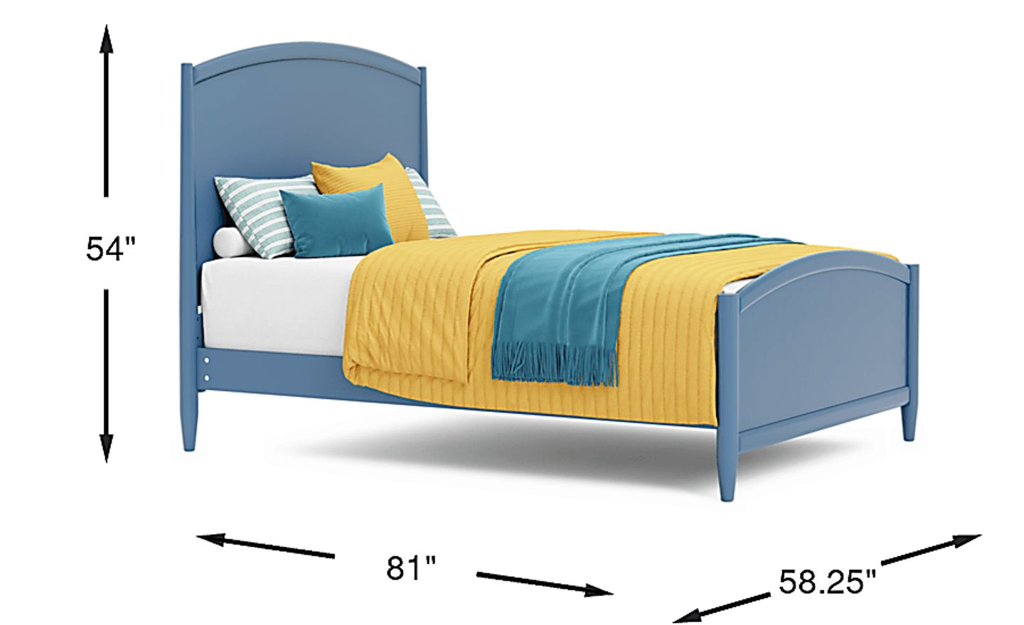 The ultimate style for your color obsession is finally here with the Modern Colors full panel bed. Showcasing slate blue finish, this piece balances ultra-sleek craftsmanship with easygoing comfort. Subtle molding on the headboard boasts a gentle arch that is echoed by the footboard. Adjustable side rails offer two heights for accessibility, making them easy to lower or raise as needed. Tapered spun legs supply the bed with a chic final touch. Mattress and foundation (if required) sold separately.