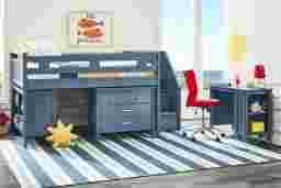 The ultimate collection for your color obsession is finally here with the Modern Colors full low loft bed. Constructed from poplar solids in slate blue finish, each piece balances ultra-sleek craftsmanship with easygoing comfort. Featuring a full bed that sits lower to the ground than a traditional loft, this piece has a reversible staircase that can be affixed to either side of the bed. The steps feature storage drawers that are perfect for stashing away clothing, books and more. The coordinating loft chest has three drawers crafted with front French dovetail joints and ball bearing, side mounted glides. A matching 37-inch bookcase can shelve books, comics, magazines, decor and more. The hardware is finished in brushed nickel but brushed gold knobs and pulls are also included with purchase. Mattress and foundation (if required) sold separately. This product requires a bunkie board (sold separately).