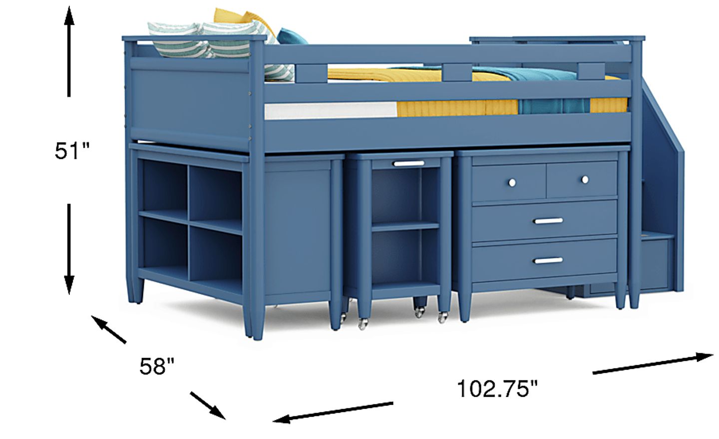 Kids Modern Colors Slate Blue Full Step Loft With Loft Chest, Bookcase And Desk