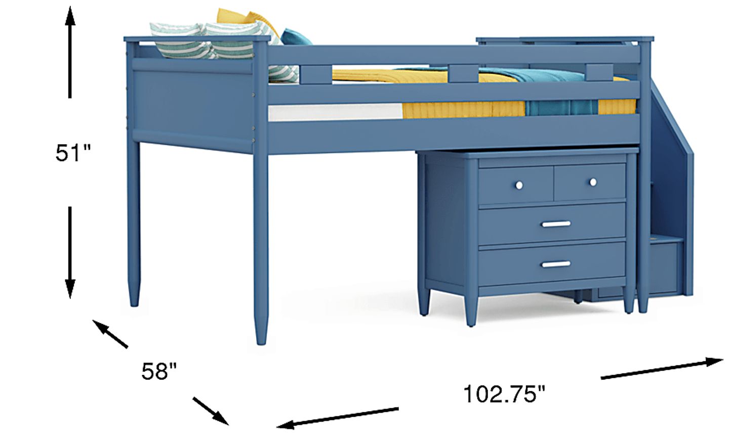 The ultimate collection for your color obsession is finally here with the Modern Colors full low loft bed. Showcasing slate blue finish, each piece balances ultra-sleek craftsmanship with easygoing comfort. Featuring a full bed that sits lower to the ground than a traditional loft, this piece has a reversible staircase that can be affixed to either side of the bed. The steps feature storage drawers that are perfect for stashing away clothing, books and more. The coordinating loft chest has three drawers crafted with front French dovetail joints and ball bearing, side mounted glides. The hardware is finished in brushed nickel but brushed gold knobs and pulls are also included with purchase. Mattress and foundation (if required) sold separately. This product requires a bunkie board (sold separately).