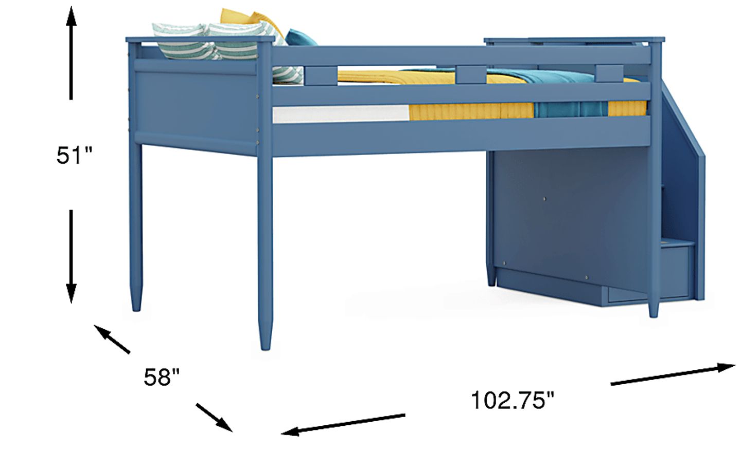 The ultimate collection for your color obsession is finally here with the Modern Colors full low loft bed. Showcasing slate blue finish, each piece balances ultra-sleek craftsmanship with easygoing comfort. Featuring a full bed that sits lower to the ground than a traditional loft, this piece has a reversible staircase that can be affixed to either side of the bed. The steps feature storage drawers that are perfect for stashing away clothing, books and more. Mattress and foundation (if required) sold separately. This product requires a bunkie board (sold separately).