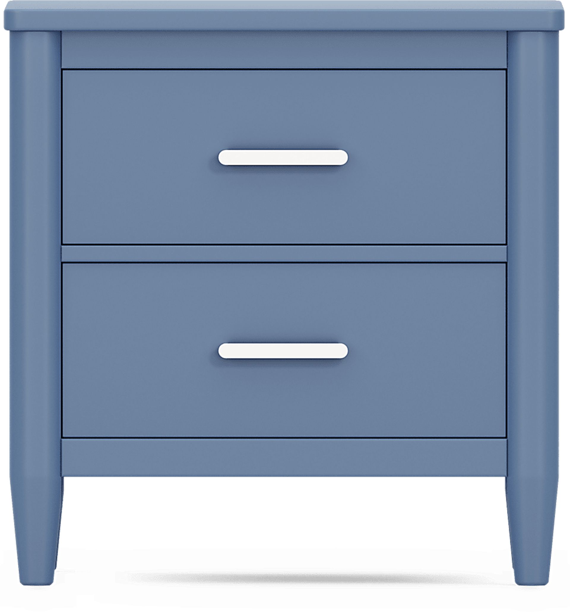 The ultimate style for your color obsession is finally here with the Modern Colors nightstand. Showcasing slate blue finish, this piece balances ultra-sleek craftsmanship with an easygoing look. Each drawer is sanded smooth to help keep bedside essentials close at hand. The drawers are crafted with front French dovetail joints and have ball bearing, side mounted glides. The pulls are finished in brushed nickel. Brushed gold hardware is also included with purchase. Tapered spun legs supply the nightstand with a chic final touch.