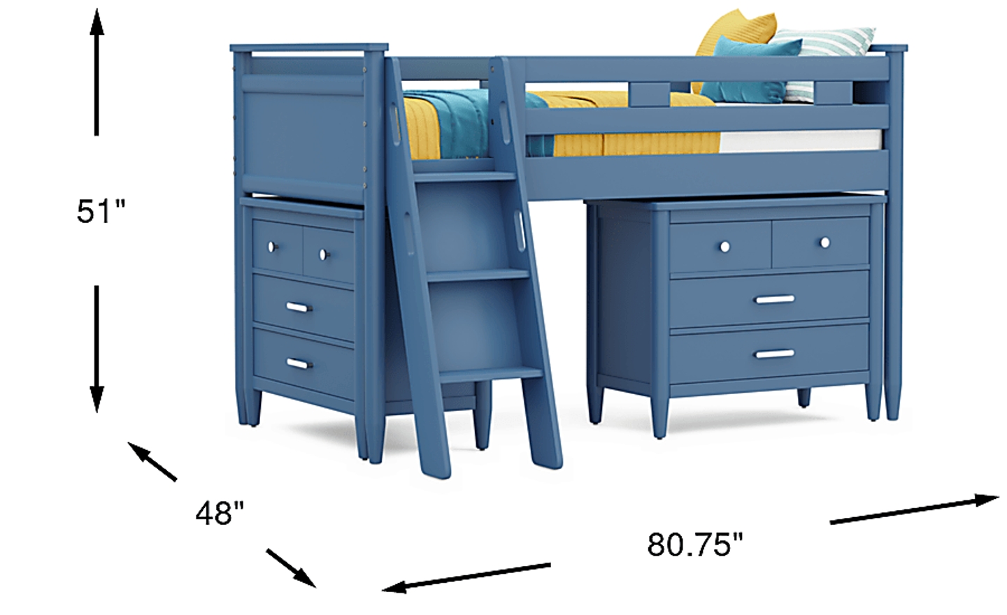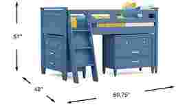 The ultimate collection for your color obsession is finally here with the Modern Colors twin low loft bed. Showcasing slate blue finish, each piece balances ultra-sleek craftsmanship with easygoing comfort. Featuring a twin bed that sits lower to the ground than a traditional loft, this piece features a ladder that affixes to the side of the frame for three easy steps up and three easy steps down. Two coordinating loft chests have three drawers crafted with front French dovetail joints and ball bearing, side mounted glides. The hardware is finished in brushed nickel but brushed gold knobs and pulls are also included with purchase. Mattress and foundation (if required) sold separately. This product requires a bunkie board (sold separately).