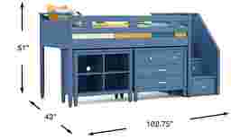 This set is a comprehensive organization solution designed to maximize floor space. It includes a coordinating three-drawer chest and a 37-inch bookcase, both of which fit neatly beneath the bed frame. Furthermore, each step of the staircase features a built-in storage drawer, providing a perfect spot for books, toys, or clothing without requiring any additional footprint in the room.
