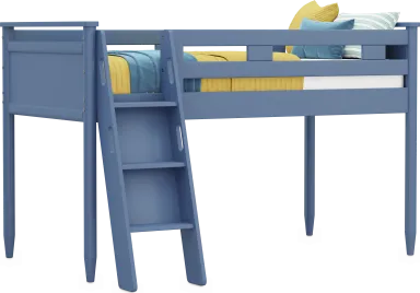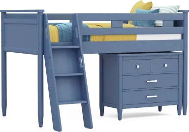 The ultimate collection for your color obsession is finally here with the Modern Colors twin low loft bed. Showcasing slate blue finish, each piece balances ultra-sleek craftsmanship with easygoing comfort. Featuring a twin bed that sits lower to the ground than a traditional loft, this piece has a reversible staircase that can be affixed to either side of the bed. The steps feature storage drawers that are perfect for stashing away clothing, books and more. The coordinating loft chest has three drawers crafted with front French dovetail joints and ball bearing, side mounted glides. The hardware is finished in brushed nickel but brushed gold knobs and pulls are also included with purchase. Mattress and foundation (if required) sold separately. This product requires a bunkie board (sold separately).