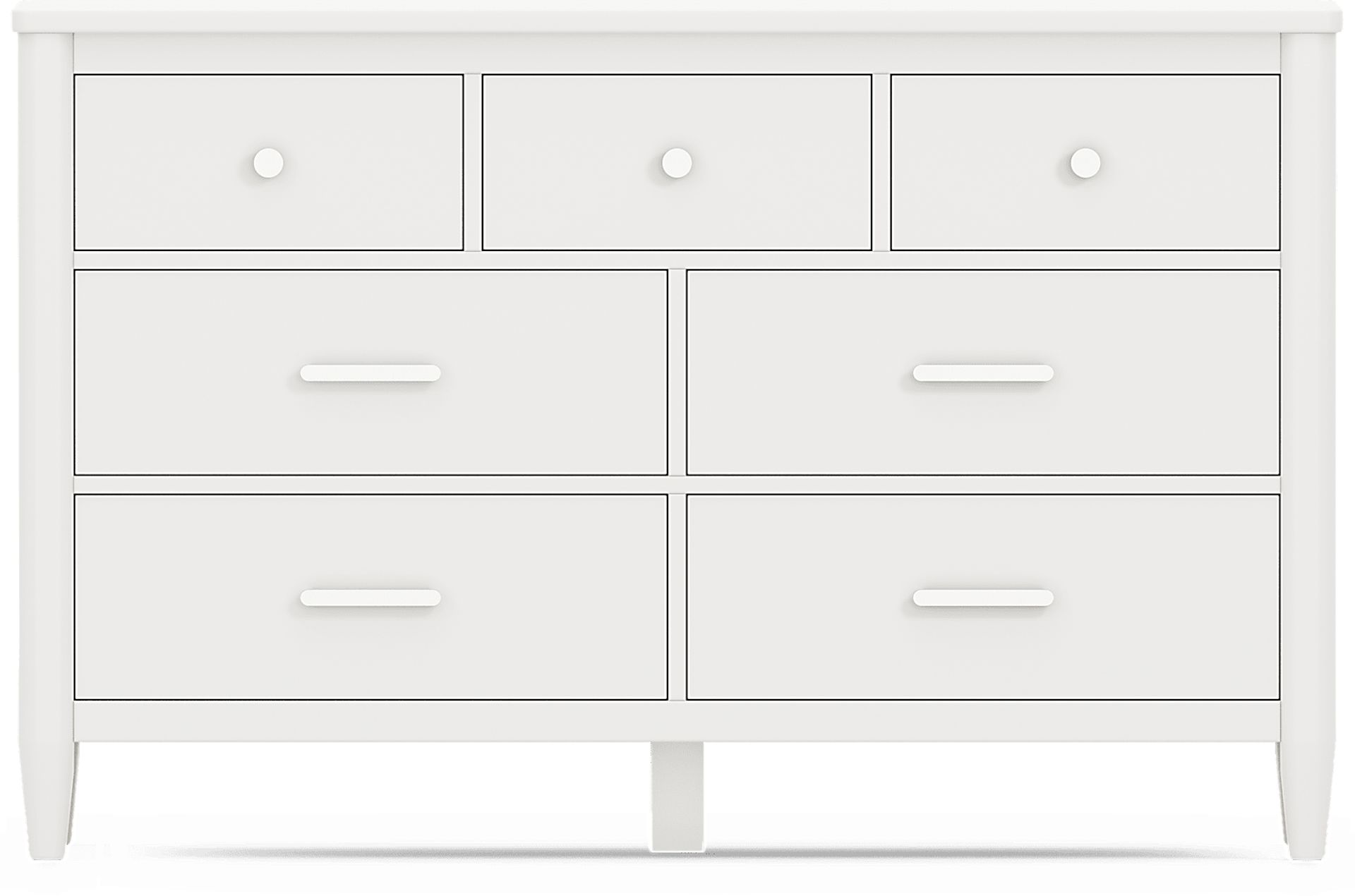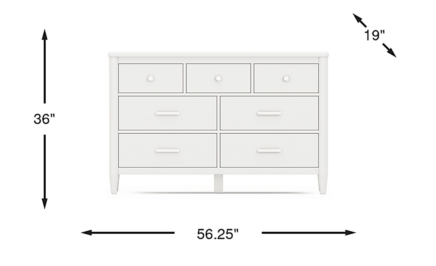 The ultimate style for your color obsession is finally here with the Modern Colors dresser. Showcasing white finish, this piece balances ultra-sleek craftsmanship with an easygoing look. Each of the seven drawers are sanded smooth to help store clothing, extra bedlinens and more. The drawers are crafted with front French dovetail joints and have ball bearing, side mounted glides. Knobs on the top three drawers and pulls on the remaining four drawers are finished in brushed nickel. Brushed gold hardware is also included with purchase. Tapered spun legs supply the dresser with a chic final touch.