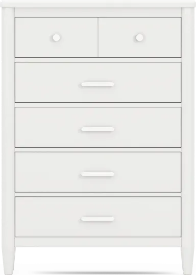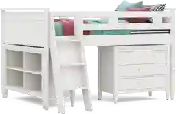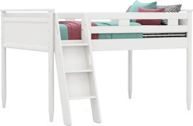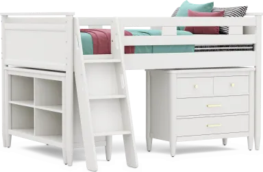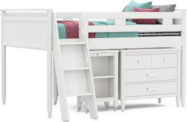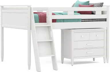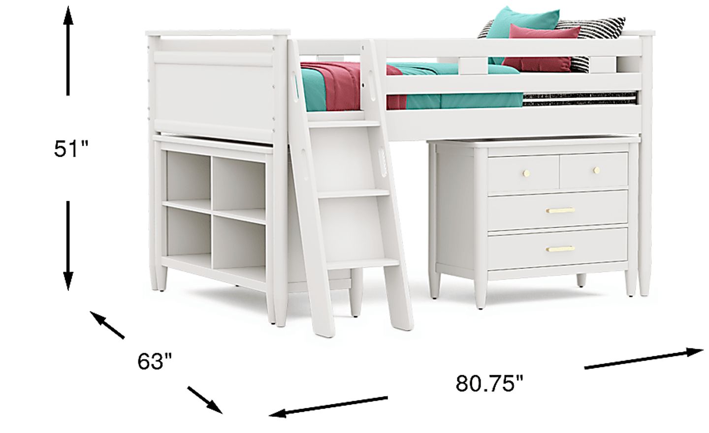 The ultimate collection for your color obsession is finally here with the Modern Colors full low loft bed. Showcasing white finish, each piece balances ultra-sleek craftsmanship with easygoing comfort. Featuring a full bed that sits lower to the ground than a traditional loft, this piece features a ladder that affixes to the side of the frame for three easy steps up and three easy steps down. The coordinating loft chest has three drawers crafted with front French dovetail joints and ball bearing, side mounted glides. A matching 52-inch bookcase can shelve books, comics, magazines, decor and more. The hardware is finished in brushed nickel but brushed gold knobs and pulls are also included with purchase. Mattress and foundation (if required) sold separately. This product requires a bunkie board (sold separately).