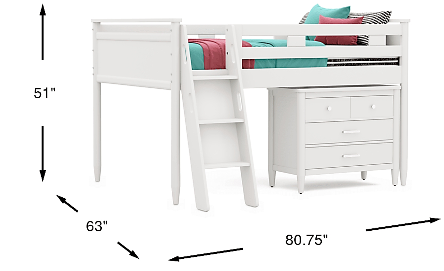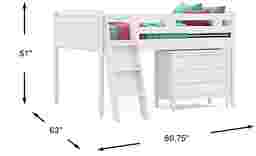 The ultimate collection for your color obsession is finally here with the Modern Colors full low loft bed. Showcasing white finish, each piece balances ultra-sleek craftsmanship with easygoing comfort. Featuring a full bed that sits lower to the ground than a traditional loft, this piece features a ladder that affixes to the side of the frame for three easy steps up and three easy steps down. The coordinating loft chest has three drawers crafted with front French dovetail joints and ball bearing, side mounted glides. The hardware is finished in brushed nickel but brushed gold knobs and pulls are also included with purchase. Mattress and foundation (if required) sold separately. This product requires a bunkie board (sold separately).