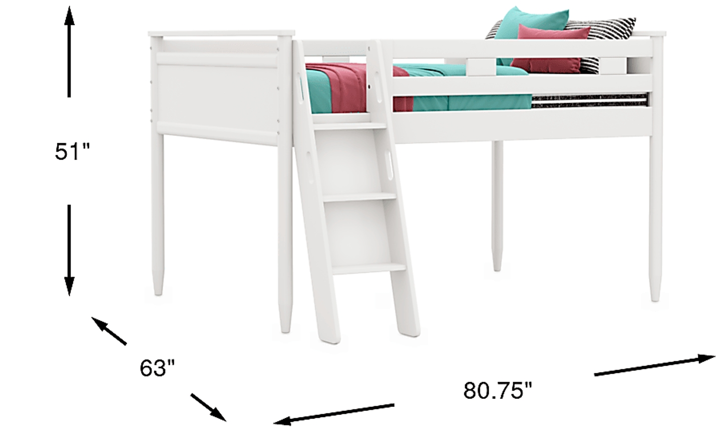 The ultimate collection for your color obsession is finally here with the Modern Colors full low loft bed. Showcasing white finish, each piece balances ultra-sleek craftsmanship with easygoing comfort. Featuring a full bed that sits lower to the ground than a traditional loft, this piece features a ladder that affixes to the side of the frame for three easy steps up and three easy steps down. Mattress and foundation (if required) sold separately. This product requires a bunkie board (sold separately).