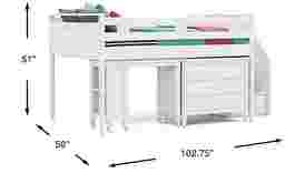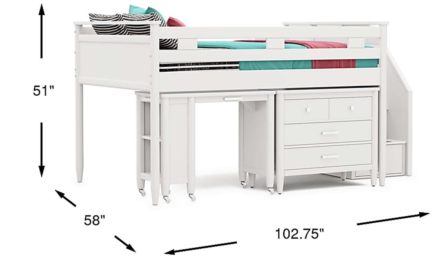 The ultimate collection for your color obsession is finally here with the Modern Colors full low loft bed. Showcasing white finish, each piece balances ultra-sleek craftsmanship with easygoing comfort. Featuring a full bed that sits lower to the ground than a traditional loft, this piece has a reversible staircase that can be affixed to either side of the bed. The steps feature storage drawers that are perfect for stashing away clothing, books and more. The coordinating loft chest has three drawers crafted with front French dovetail joints and ball bearing, side mounted glides. Soar through study time with the coordinating caster desk that can be wheeled out and around at a moment's notice. The desk even has a couple cubbies that are perfect for textbooks or homework supplies. The hardware is finished in brushed nickel but brushed gold knobs and pulls are also included with purchase. Mattress and foundation (if required) sold separately. This product requires a bunkie board (sold separately).