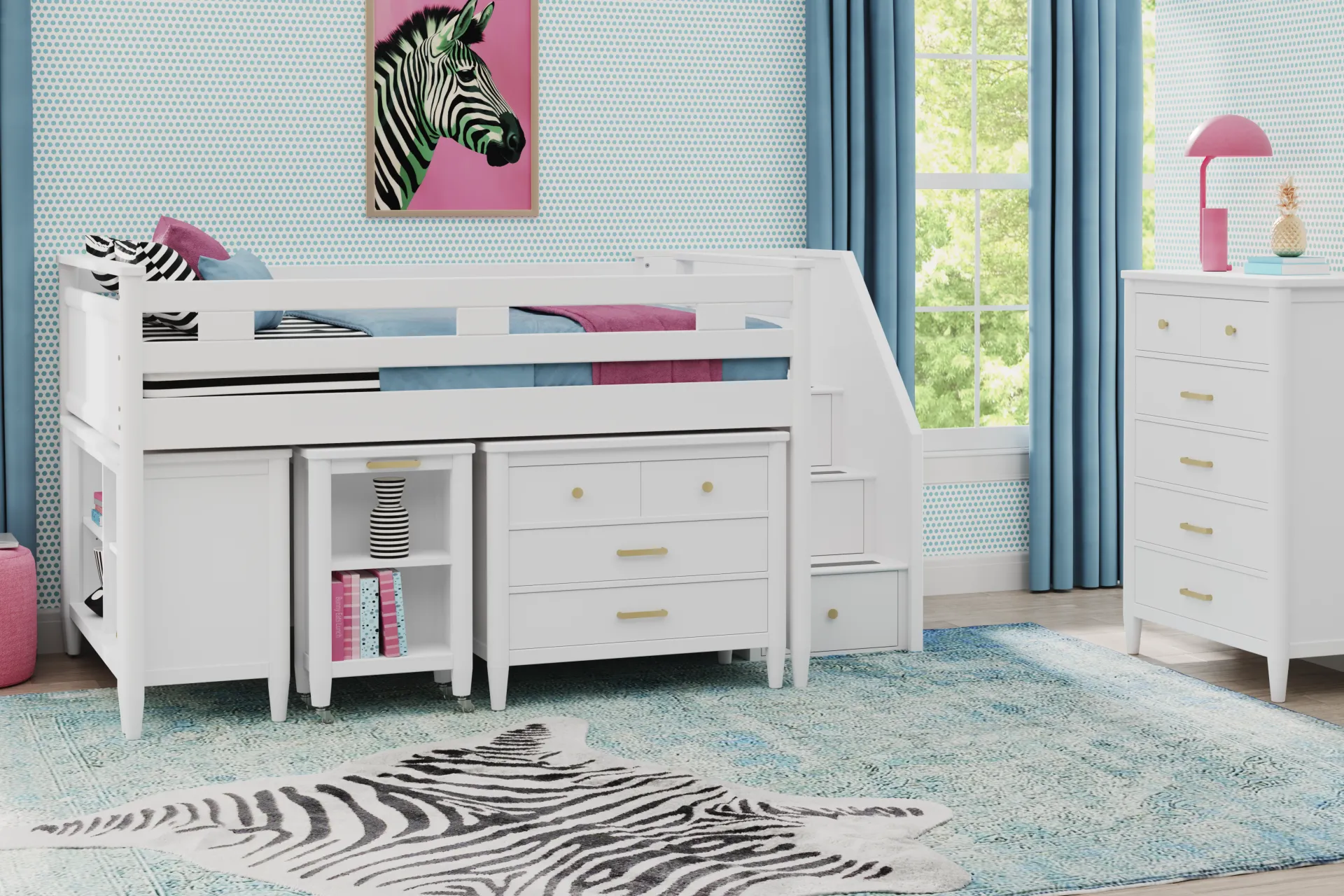 The ultimate collection for your color obsession is finally here with the Modern Colors full low loft bed. Showcasing white finish, each piece balances ultra-sleek craftsmanship with easygoing comfort. Featuring a full bed that sits lower to the ground than a traditional loft, this piece has a reversible staircase that can be affixed to either side of the bed. The steps feature storage drawers that are perfect for stashing away clothing, books and more. The coordinating loft chest has three drawers crafted with front French dovetail joints and ball bearing, side mounted glides. Soar through study time with the coordinating caster desk that can be wheeled out and around at a moment's notice. The desk even has a couple cubbies that are perfect for textbooks or homework supplies. A matching 52-inch bookcase can shelve books, comics, magazines, decor and more. The hardware is finished in brushed nickel but brushed gold knobs and pulls are also included with purchase. Mattress and foundation (if required) sold separately. This product requires a bunkie board (sold separately).