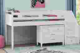 The ultimate collection for your color obsession is finally here with the Modern Colors full low loft bed. Constructed from poplar solids in white finish, each piece balances ultra-sleek craftsmanship with easygoing comfort. Featuring a full bed that sits lower to the ground than a traditional loft, this piece has a reversible staircase that can be affixed to either side of the bed. The steps feature storage drawers that are perfect for stashing away clothing, books and more. The coordinating loft chest has three drawers crafted with front French dovetail joints and ball bearing, side mounted glides. The hardware is finished in brushed nickel but brushed gold knobs and pulls are also included with purchase. Mattress and foundation (if required) sold separately. This product requires a bunkie board (sold separately).
