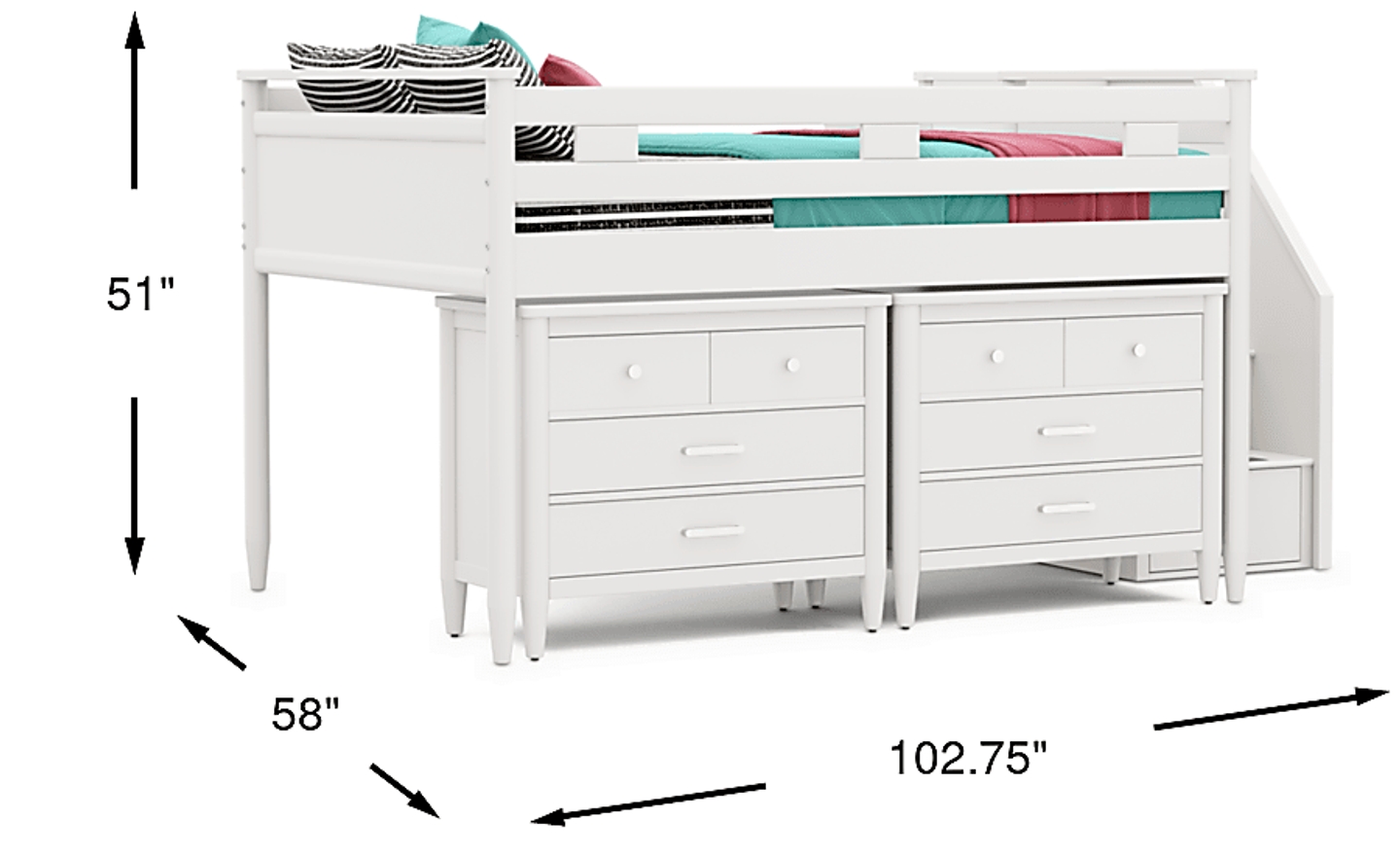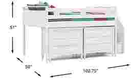 The ultimate collection for your color obsession is finally here with the Modern Colors full low loft bed. Showcasing white finish, each piece balances ultra-sleek craftsmanship with easygoing comfort. Featuring a full bed that sits lower to the ground than a traditional loft, this piece has a reversible staircase that can be affixed to either side of the bed. The steps feature storage drawers that are perfect for stashing away clothing, books and more. The two coordinating loft chests each have three drawers crafted with front French dovetail joints and ball bearing, side mounted glides. All hardware is finished in brushed nickel but brushed gold knobs and pulls are also included with purchase. Mattress and foundation (if required) sold separately. This product requires a bunkie board (sold separately).