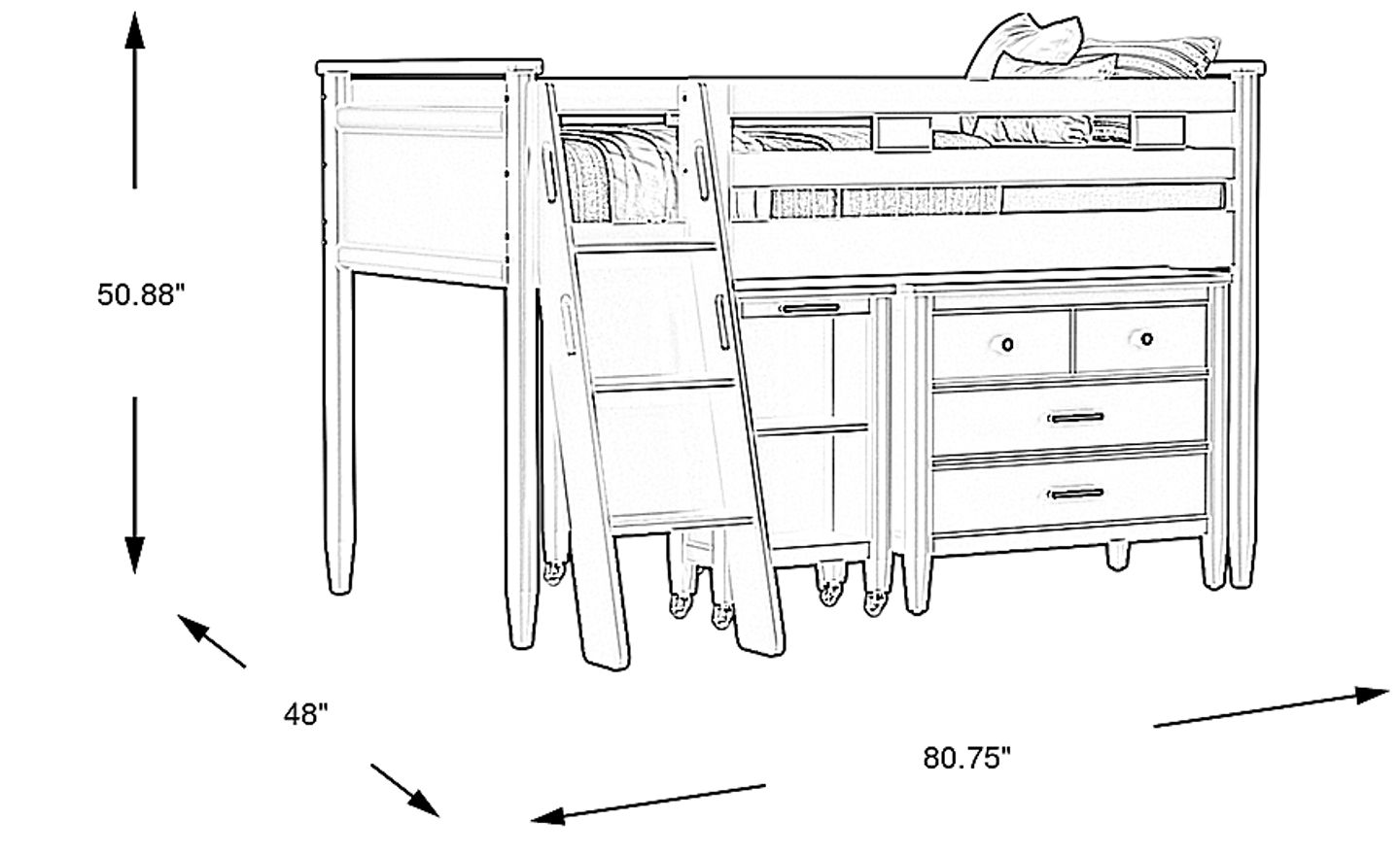 This "all-in-one" sleep and study system is specifically engineered for space optimization. By elevating the twin bed, it creates a functional footprint of approximately 81" x 48" that includes a 3-drawer chest for clothing and a versatile caster desk. The desk can be tucked neatly under the frame when not in use or wheeled out for study sessions, making it an ideal solution for compact city living where floor space is at a premium.