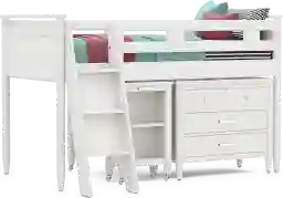 The ultimate collection for your color obsession is finally here with the Modern Colors twin low loft bed. Showcasing white finish, each piece balances ultra-sleek craftsmanship with easygoing comfort. Featuring a twin bed that sits lower to the ground than a traditional loft, this piece features a ladder that affixes to the side of the frame for three easy steps up and three easy steps down. The coordinating loft chest has three drawers crafted with front French dovetail joints and ball bearing, side mounted glides. Soar through study time with the coordinating caster desk that can be wheeled out and around at a moment's notice. The desk even has a couple cubbies that are perfect for textbooks or homework supplies. The hardware is finished in brushed nickel but brushed gold knobs and pulls are also included with purchase. Mattress and foundation (if required) sold separately. This product requires a bunkie board (sold separately).