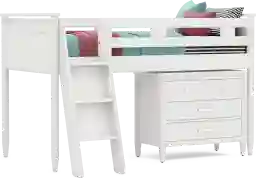 The ultimate collection for your color obsession is finally here with the Modern Colors twin low loft bed. Showcasing white finish, each piece balances ultra-sleek craftsmanship with easygoing comfort. Featuring a twin bed that sits lower to the ground than a traditional loft, this piece features a ladder that affixes to the side of the frame for three easy steps up and three easy steps down. The coordinating loft chest has three drawers crafted with front French dovetail joints and ball bearing, side mounted glides. The hardware is finished in brushed nickel but brushed gold knobs and pulls are also included with purchase. Mattress and foundation (if required) sold separately. This product requires a bunkie board (sold separately).