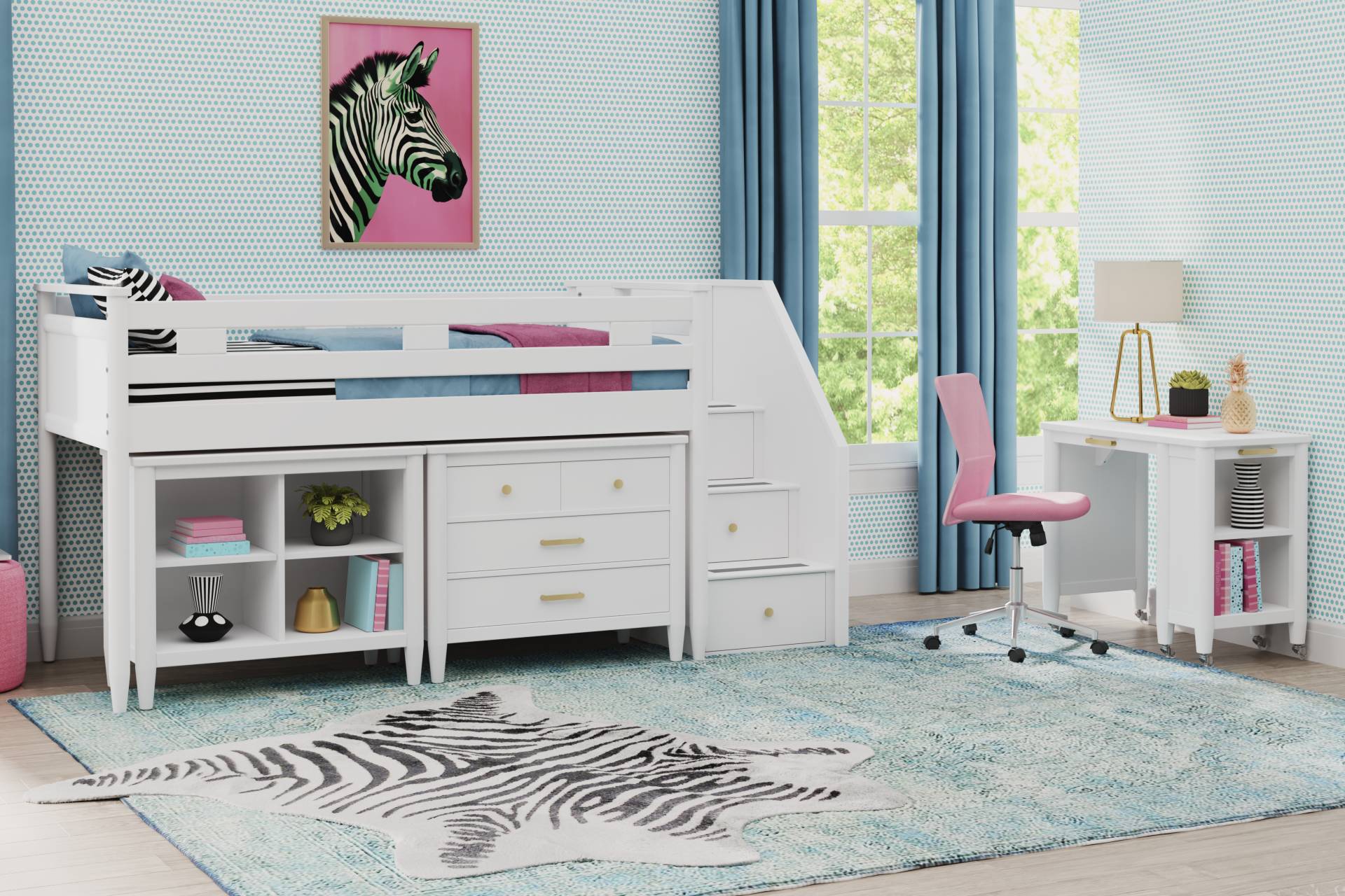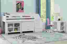 The ultimate collection for your color obsession is finally here with the Modern Colors twin low loft bed. Constructed from poplar solids in white finish, each piece balances ultra-sleek craftsmanship with easygoing comfort. Featuring a twin bed that sits lower to the ground than a traditional loft, this piece has a reversible staircase that can be affixed to either side of the bed. The steps feature storage drawers that are perfect for stashing away clothing, books and more. The coordinating loft chest has three drawers crafted with front French dovetail joints and ball bearing, side mounted glides. A matching 37-inch bookcase can shelve books, comics, magazines, decor and more. The hardware is finished in brushed nickel but brushed gold knobs and pulls are also included with purchase. Mattress and foundation (if required) sold separately. This product requires a bunkie board (sold separately).