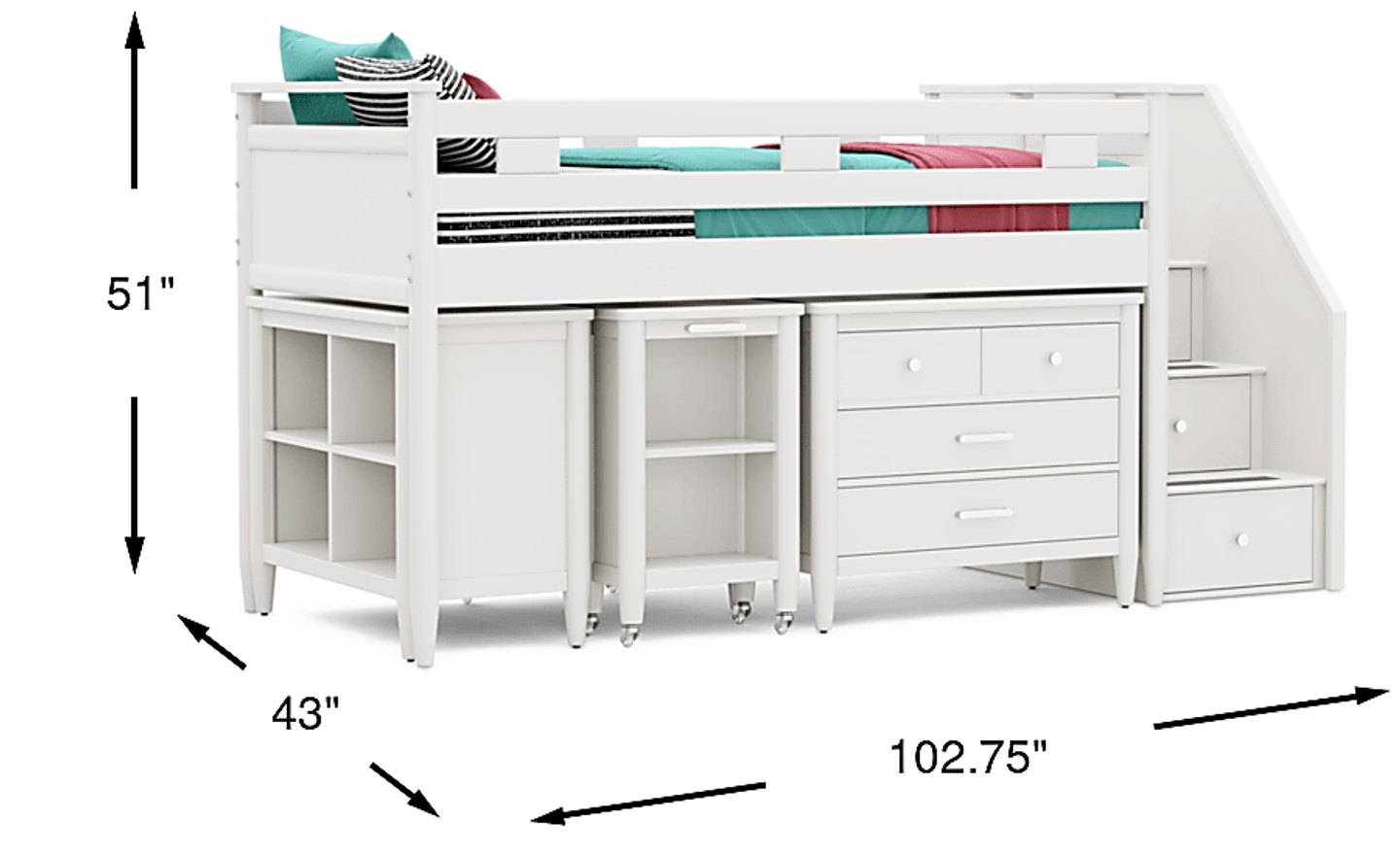 The ultimate collection for your color obsession is finally here with the Modern Colors twin low loft bed. Showcasing white finish, each piece balances ultra-sleek craftsmanship with easygoing comfort. Featuring a twin bed that sits lower to the ground than a traditional loft, this piece has a reversible staircase that can be affixed to either side of the bed. The steps feature storage drawers that are perfect for stashing away clothing, books and more. The coordinating loft chest has three drawers crafted with front French dovetail joints and ball bearing, side mounted glides. Soar through study time with the coordinating caster desk that can be wheeled out and around at a moment's notice. The desk even has a couple cubbies that are perfect for textbooks or homework supplies. A matching 37-inch bookcase can shelve books, comics, magazines, decor and more. The hardware is finished in brushed nickel but brushed gold knobs and pulls are also included with purchase. Mattress and foundation (if required) sold separately. This product requires a bunkie board (sold separately).