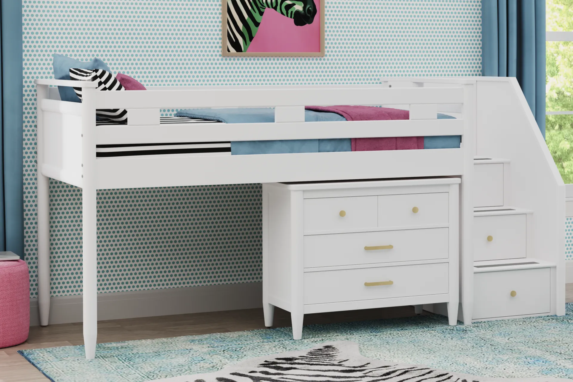 The ultimate collection for your color obsession is finally here with the Modern Colors twin low loft bed. Showcasing white finish, each piece balances ultra-sleek craftsmanship with easygoing comfort. Featuring a twin bed that sits lower to the ground than a traditional loft, this piece has a reversible staircase that can be affixed to either side of the bed. The steps feature storage drawers that are perfect for stashing away clothing, books and more. The coordinating loft chest has three drawers crafted with front French dovetail joints and ball bearing, side mounted glides. The hardware is finished in brushed nickel but brushed gold knobs and pulls are also included with purchase. Mattress and foundation (if required) sold separately. This product requires a bunkie board (sold separately).