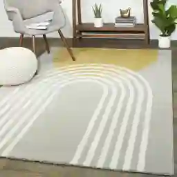Bring a touch of magic to your child's room with our Moon Door rug featuring a white rainbow pattern. Soft and durable, it's perfect for playtime, storytime or any time. Its neutral color scheme will blend seamlessly with any room decor, while its playful pattern will add a fun and whimsical touch. Plus, it's easy to clean and maintain, making it the perfect addition to any busy household. This supple, smooth low pile rug with a 100% microset polypropylene pile is stain resistant and non-shedding. Customer assembly required.