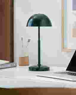 Introducing the Kids Mush Peak Lamp, a striking addition to your kid's room that effortlessly merges arts and crafts traditional style with modern elegance. Standing at a charming 15 inches tall, this lamp boasts a green iron body and base for a robust yet refined look, while its metal shade casts a warm, inviting glow. Perfect for adding a touch of funk to your kid's room. Partial assembly may be required.