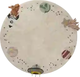 Transform your child's room into a space adventure with this interstellar natural canvas rug. Featuring charming designs around the border of three planets, a rocket, a shooting star, and a UFO, this rug is perfect for young explorers and aspiring astronauts. A piece of art to take a walk in the immense universe. Your room will arrive to new universes.