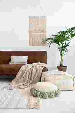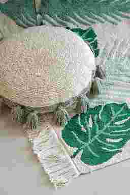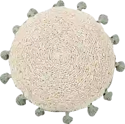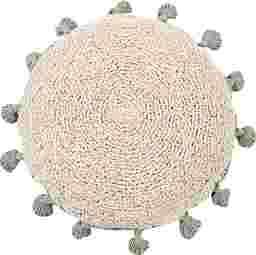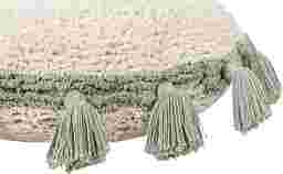 This is a unique artisan piece, carefully designed by Lorena Canals. Enjoy this filled washable round cushion with base in Natural color using loop technique and medium green tassels.