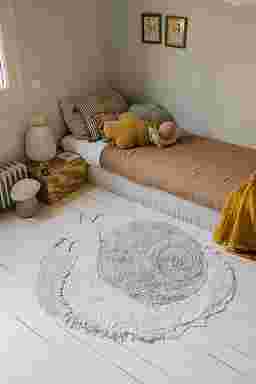 Say hello to the newest addition to your family. With a beautifully rounded shell in blue sage and soft green hues, its lush textures mimic the intricate swirl of a real snail's shell. A natural-toned body frames the shell, lined with hand-cut fringes and topped with braided antennae for that extra handcrafted flair. This rug doesn't just decorate-it transforms your space into a magical garden retreat. Bring nature indoors with a touch of playfulness and plenty of comfort.