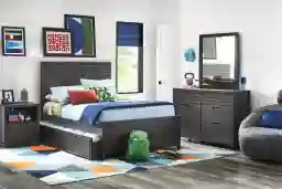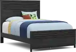 If you think Northridge Drive is just another cookie cutter bedtime style, get ready to have your mind blown by a cool collection that has more charm than an entire neighborhood of gingerbread houses. This traditional kids room features a full panel bed alongside coordinating pieces crafted in a sweet charcoal finish. A design motif of layered slats unifies the bed and matching dresser with a stunning shutter effect. All six of the dresser drawers are made with French dovetailing in front and English dovetail joints in back for enhanced durability and feature glides affixed to the bottom center of each drawer. Zinc alloy hardware, finished in a powder coated copper brown color, affords the dresser a reserved flourish of contemporary flair. A beveled glass mirror with a small shelf mounts to the dresser and completes the look. Mattress and foundation (if required) sold separately.