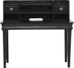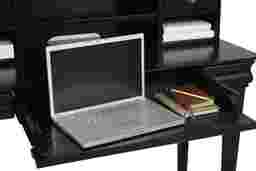 The Oberon computer desk has a drop down keyboard tray, making it the perfect piece for a study corner. The matching hutch has multiple cubbies for display and two cabinets for additional storage. A cut out in the back makes it easy to plug in your computer and keep cords neat. Crafted of poplar solids with a black finish and round pewter hardware, the edges are rounded for safety and style.