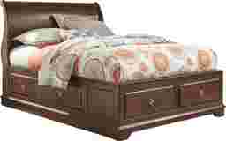 Crafted of poplar solids with a rich dark cherry finish, the Oberon sleigh bed features a sleigh style headboard and low footboard. The gentle scrolls of this popular bed have been smoothed and rounded, making them kid safe and appealing. Storage drawers in the footboard and side rails create a great place to store anything from seasonal clothes to toys or books, adding additional functionality to this space-saving bed. Mattress and foundation (if required) sold separately. Bed shown is full size. Bunkie required for mattress support.