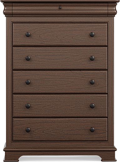 From staying up past your bedtime to oversleeping in style, the Oberon collection adds calmness and coolness to your routine. Crafted with Mindi veneers, this sweet set offers ample storage alongside convenient power features. Rich chocolate finish provides the perfect backdrop for any decor. Drawers on the bed rails provide storage for extra blankets, PJs and more nightly essentials. The matching dresser's built-in power strip includes two AC outlets, one USB-A and one USB-C fast-charging port for ultra-convenience while felt-lined top drawers provide accessories with a soft surface. All drawers are joined with English dovetailing in the front and back for enhanced durability and smoothly open thanks to double extension glides. Rounding out the look with function and flair, the mirror hutch features an LED light strip and built-in charging of its own. Mattress and foundation (if required) sold separately.