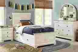 From staying up past your bedtime to oversleeping in style, the Oberon collection adds calmness and coolness to your routine. Crafted with beautiful oak veneers, this sweet set offers ample storage alongside convenient power features. Smooth cream finish provides the perfect backdrop for any decor, while cookie-tone tops on the bed and case pieces add rich contrast for a touch of opulence. The matching dresser's built-in power strip includes two AC outlets, one USB-A and one USB-C fast-charging port for ultra-convenience while felt-lined top drawers provide accessories with a soft surface. The drawers are joined with English dovetailing in the front and back for enhanced durability and smoothly open thanks to double extension glides. Rounding out the look with function and flair, the mirror hutch features an LED light strip and built-in charging of its own. Mattress and foundation (if required) sold separately.