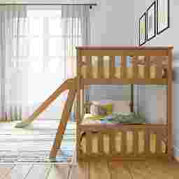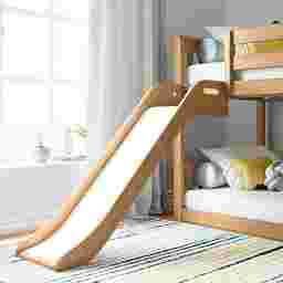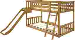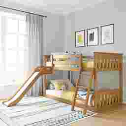 Make every bedtime an adventure with the Ozola Twin Over Twin Low Bunk Bed, complete with a fun, easy-to-use slide. This smart, space-saving design combines sleep and play in one cozy spot kids will love. Built from knot-free solid wood and finished with a non-toxic, low VOC coating, it's as safe and sturdy as it is stylish. Each bunk supports up to 400 pounds thanks to strong plywood slats, a reinforced metal support bar, and secure metal-on-metal connections. The ladder and slide can be placed on either side, giving you flexibility to fit your room perfectly. With modern slatted headboards, flush color-matched hardware, and a low profile, this bunk bed blends fun with a clean, contemporary look. Customer assembly is required.