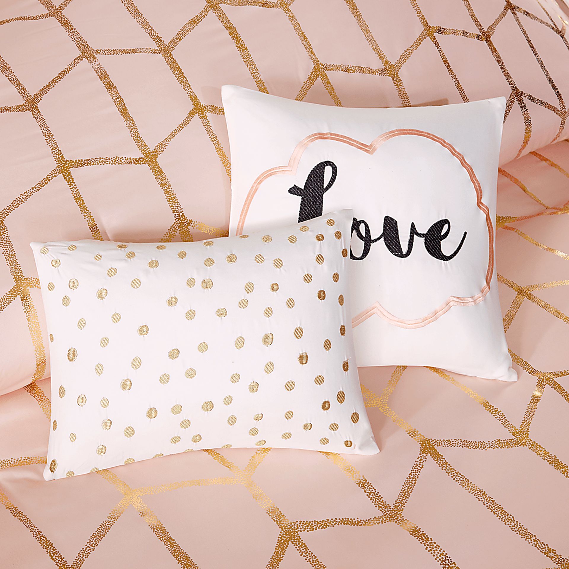 Freshen up your bedroom with the enchanting style of Penmare 4 piece comforter set. The stunning comforter flaunts a geometric, metallic gold print against a soft blush background for a fun and eye-catching look! Matching sham echo the design seen on top of the bed to pull the entire ensemble together. Two embroidered decorative pillows with typography and metallic details complete this fabulous, ultra-soft microfiber comforter set. Set includes comforter, 1 sham, 1 oblong and 1 square decorative pillows. The set is made of super soft microfiber face fabric with hypoallergenic polyester filling.