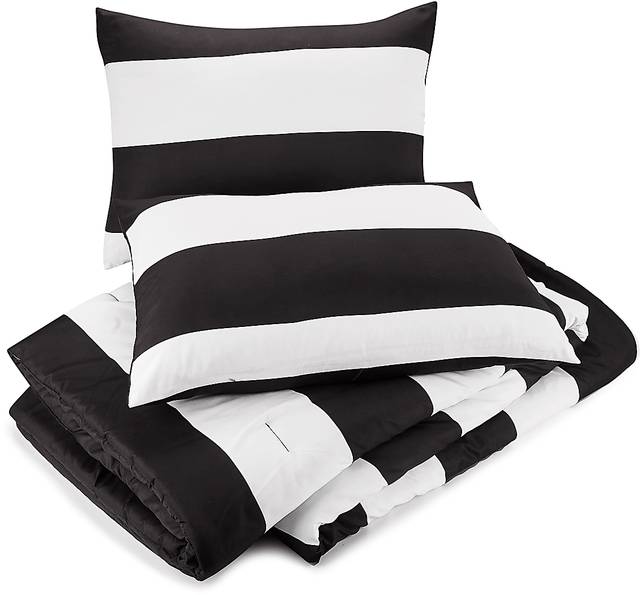 Make sure your little sport gets a good night rest with the Plovar 3 piece comforter set. This bold and versatile printed stripe adds a modern touch to your room. The printed face reverses to a solid making this comforter completely reversible. This easy care set is made of super soft brushed polyester. This comforter set is complete with two matching shams.