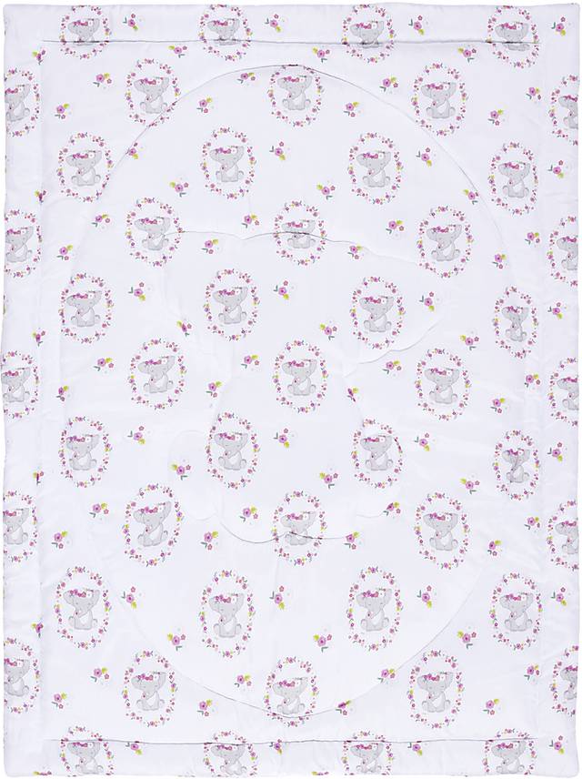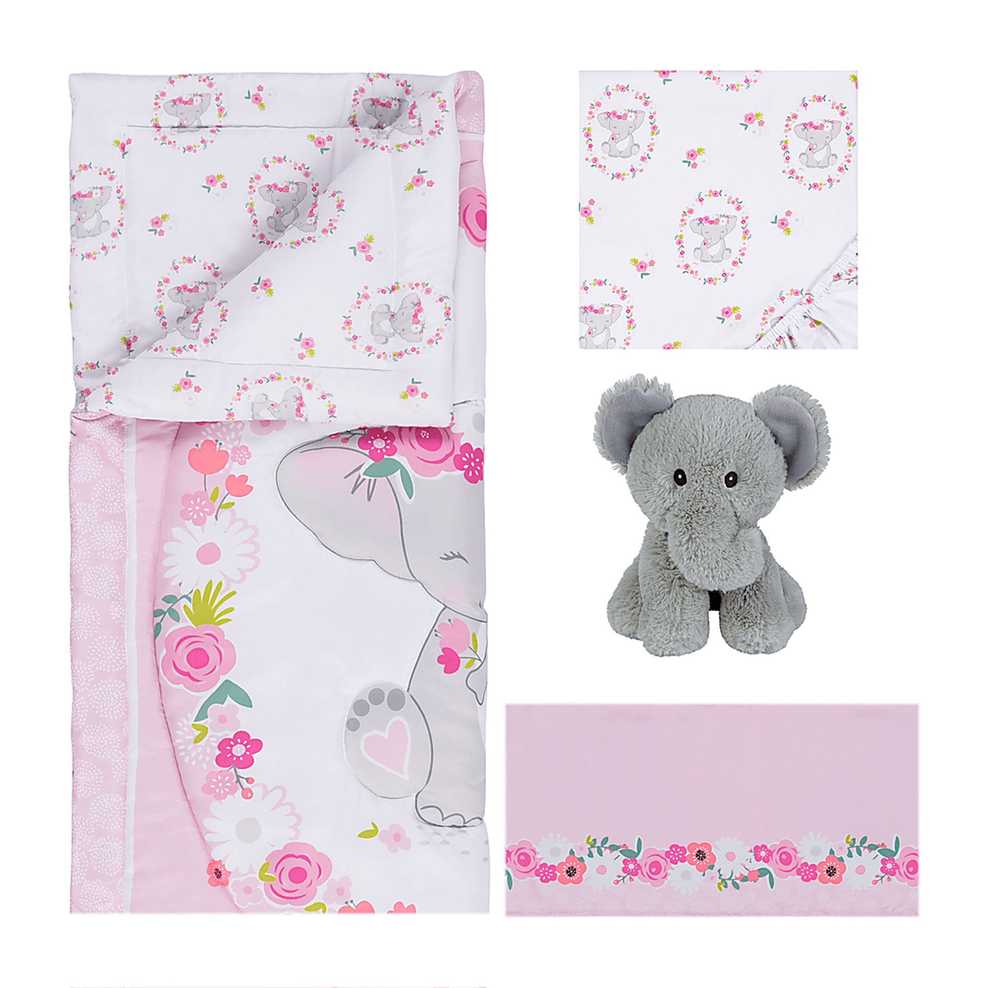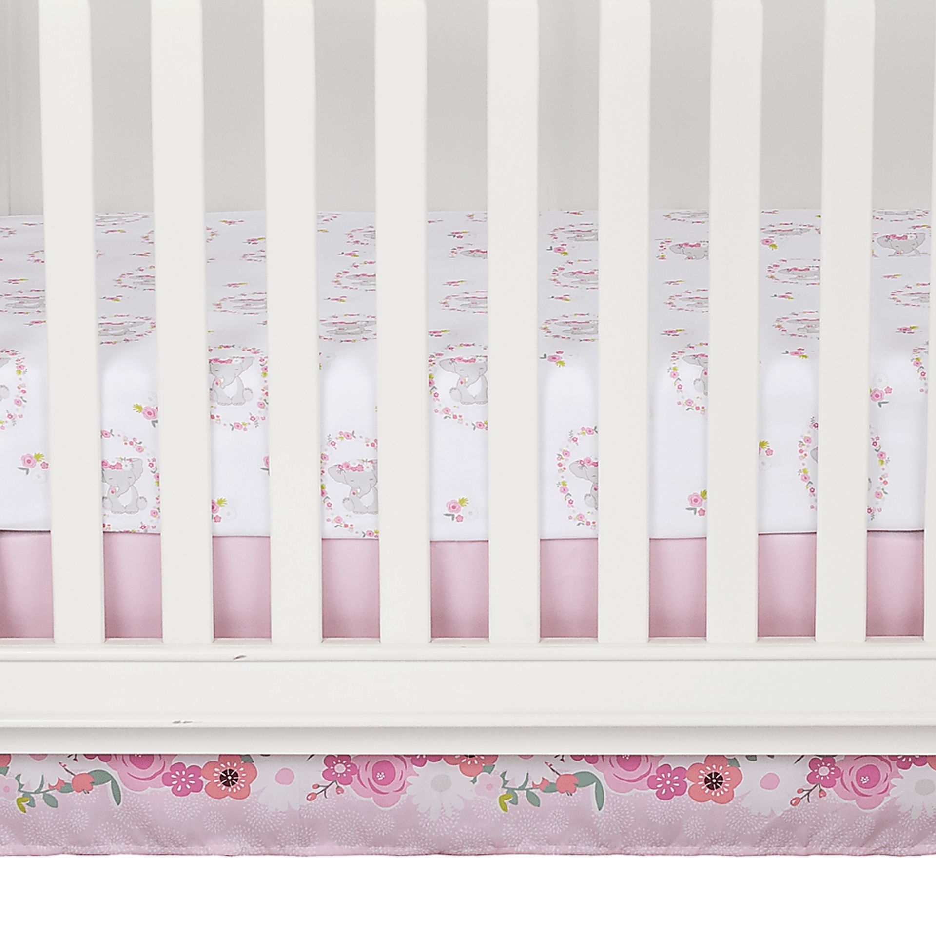 Add a lovely floral pop to your nursery with our Elephant Garden 4 Piece Crib Bedding Set. This collection features an adorable baby elephant portrait framed by delicate flowers. The combination of the soft pink and green palettes make this bedding set a perfect pick for your baby girls' nursery. Please adhere to JPMA's safe infant bedding practices. Set Includes nursery quilt measures 35 in x 45 in and features a sweet glacier gray elephant surrounded by a portrait of lovely florals in coral blush, poppy pink, salmon, light green, sea glass and auburn on a light pink background. The border features a white inner boarder and light pink outer border with white fireworks. The back of the quilt is a scatter print of elephant portraits mirroring the front. Fitted crib sheet fits standard crib mattress 28 in x 52 in with 8-inch-deep pockets and is fully elasticized for a secure fit. Customer assembly required.