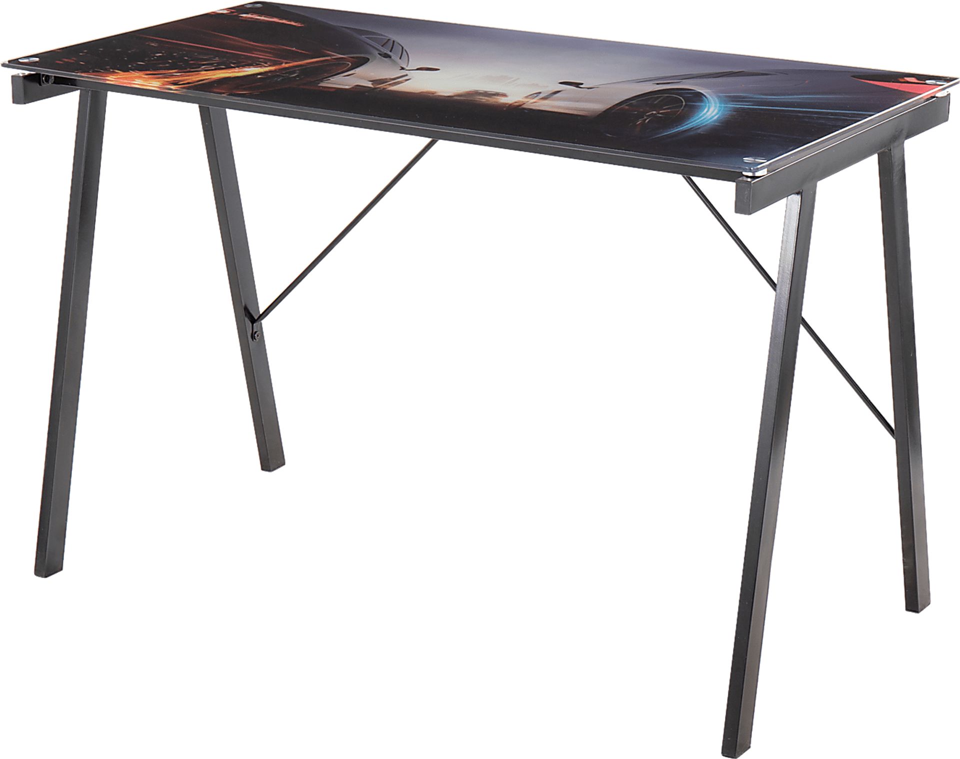 Beep, beep! Speed through study time with the Racers desk. Crafted with a black frame, this piece's surface features awesome art of two luxury vehicles sitting side by side at dusk. The print is encased by tempered glass that's easy to clean.