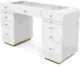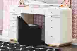 Made to let your style shimmer and shine, the Radiance collection creates a space that feels polished, purposeful and totally you-nique. This vanity desk's clean, symmetrical design is enhanced by multiple drawers across the front and sides to store beauty products, accessories and more. Finished in crisp white with soft, warm gold-tone hardware, this piece is perfect for the confident and creative fashionista in your household.