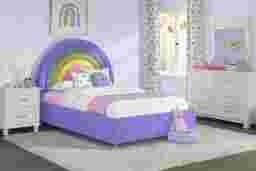 Shoot for the moon, aim for the stars and land in the comfort and security of the Rainbow Joy bed. Sweet and stylish, you'll love the soft velvet fabric in a rainbow pattern that fully covers this piece's headboard. Fashioned with purple, blue, green, and yellow upholstery, the twin-size rays are offset by pink in the center. White LED lighting outlines the headboard's arch, providing an ingenious nightlight for kids to use before bed. Touch sensors on both sides of the bed control the light while the left-facing switch doubles as a charging port with USB-A and USB-C capabilities. The frame, crafted of durable hardwood, features bun feet painted pink to match the rest of the piece. Mattress and foundation (if required) sold separately.