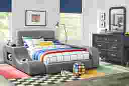 Modern and fun style come together with the Recharged bed. Upholstered with a look of leather fabric in a beautiful gray color, this bed features contemporary lines. A matching, attachable nightstand, lounger and bookcase come with this room. Upholstery: 100% Polyester. Mattress and foundation sold separately.