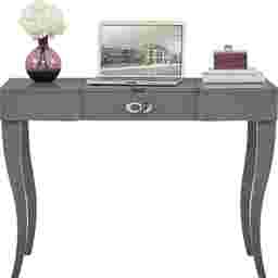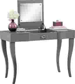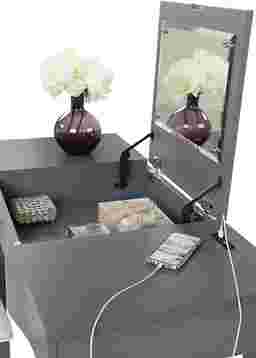 An ideal choice for the fashionista in your life, the Rylee vanity desk is the perfect space to prepare for the day ahead. Made from poplar solids and birch veneers in a chic stone gray finish, the top features a fliptop lid and two USB outlets. Polished chrome hardware accents the shaped drawer front.